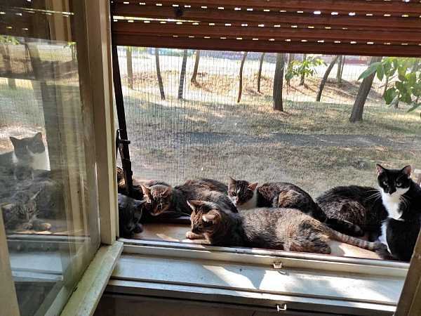 Vooral dankzij de vele adoptanten-op-afstand die maandelijks een bedrag doneren, waarvan zij dit prachtige werk dag en nacht kan blijven doen. En dan nu in een veel betere situatie, waarbij de katten in een aangebouwde buitenren als de temperatuur zich daar ook maar enigszins voor leent, in het zonnetje kunnen gaan liggen.